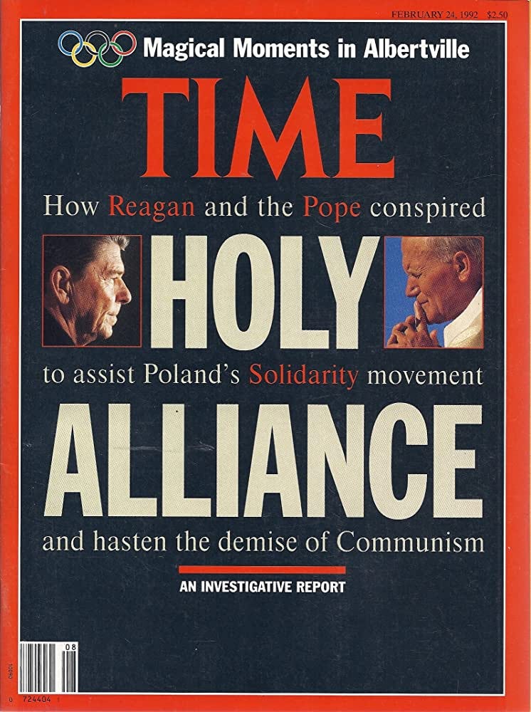The contrivance and intriguing gamesmanship that led to Communism’s neutralization were detailed in the widely influential publication, Time magazine. The journal dedicated a full edition to the machination entitled, HOLY Alliance…How Reagan and the Pope conspired to assist Poland’s Solidarity Movement and hasten the demise of Communism (February 24, 1992). Of the two remaining players on the grand chessboard for world domination, Malachi Martin assured his readers that his church, Catholicism, is determined to be the victor at any cost necessary. His prediction is coming to pass before our eyes.